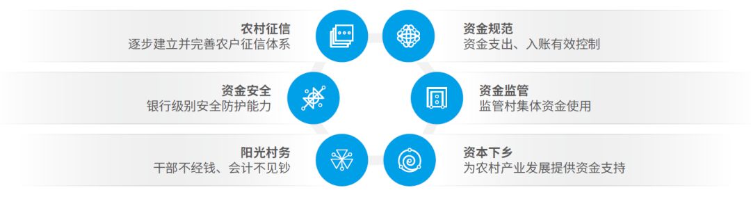 ● 以集体资金非现金结算系统——银农直连产品为核心,融合农村管理、农业生产经营服务相关的金融服务场景以及农业农村大数据,打造农业农村金融服务整体解决方案,助力金融服务下沉乡村基层,解决农村征信系统缺失、金融基础设施匮乏、融资难融资贵等问题,构建农业农村金融账户生态、交易结算生态、信贷生态,助推普惠三农、乡村振兴。