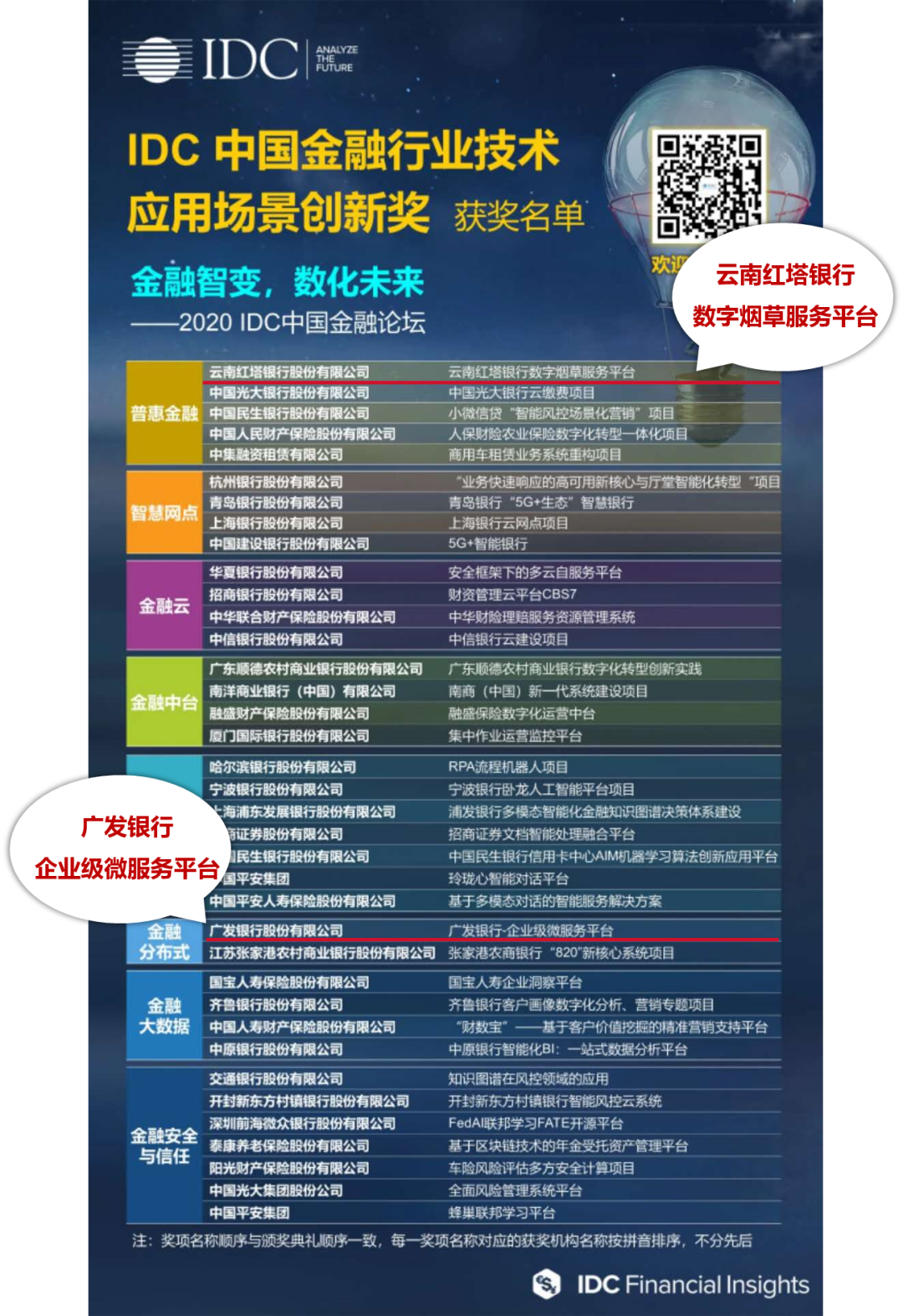 近日,IDC正式公布“2020年度中国金融行业技术应用场景创新奖”获奖名单。BB贝博艾弗森官网承建的“云南红塔银行数字烟草服务平台”与“广发银行企业级微服务平台”分获 “普惠金融技术应用场景创新奖”、 “金融分布式技术应用场景创新奖”两项大奖!