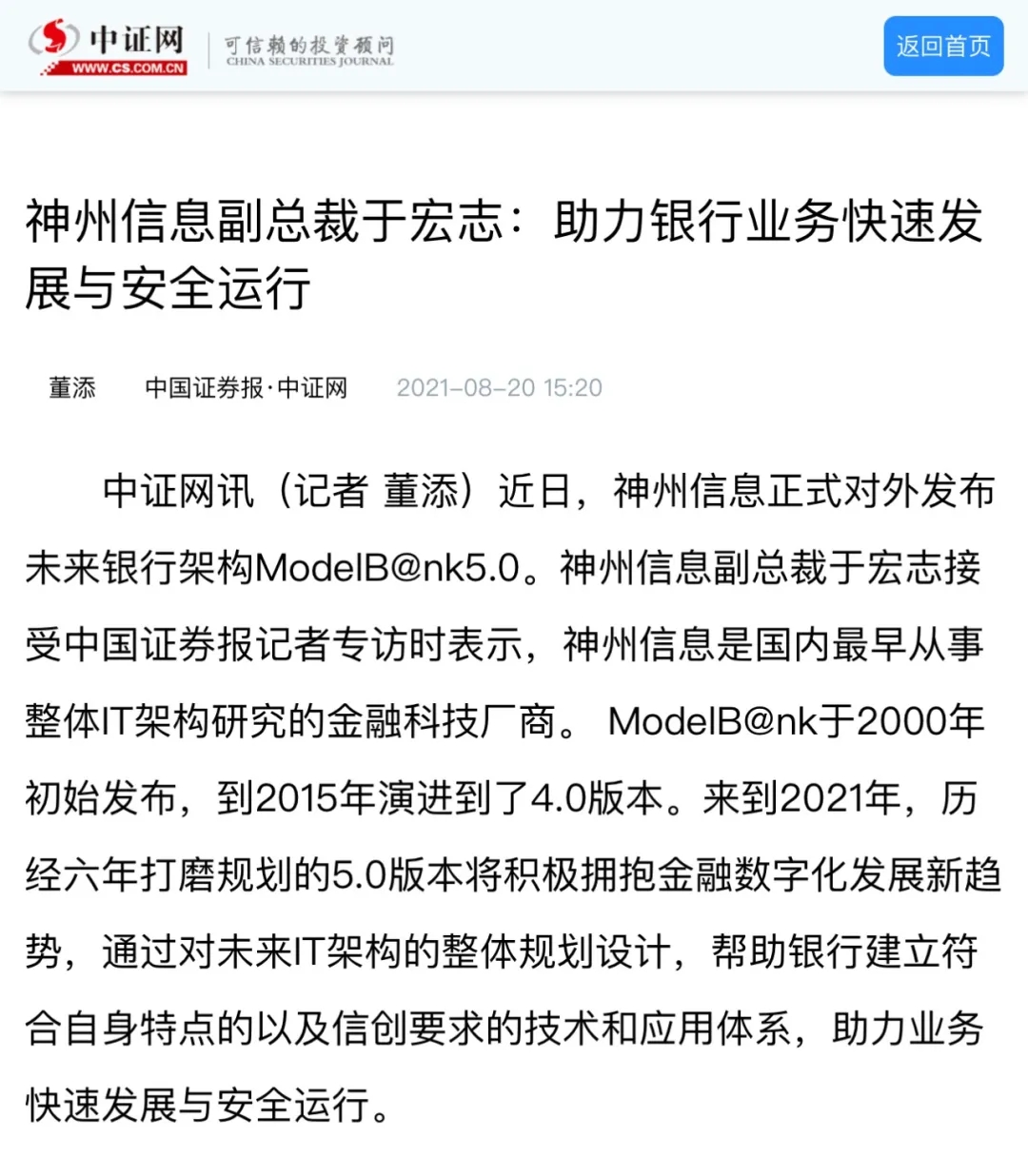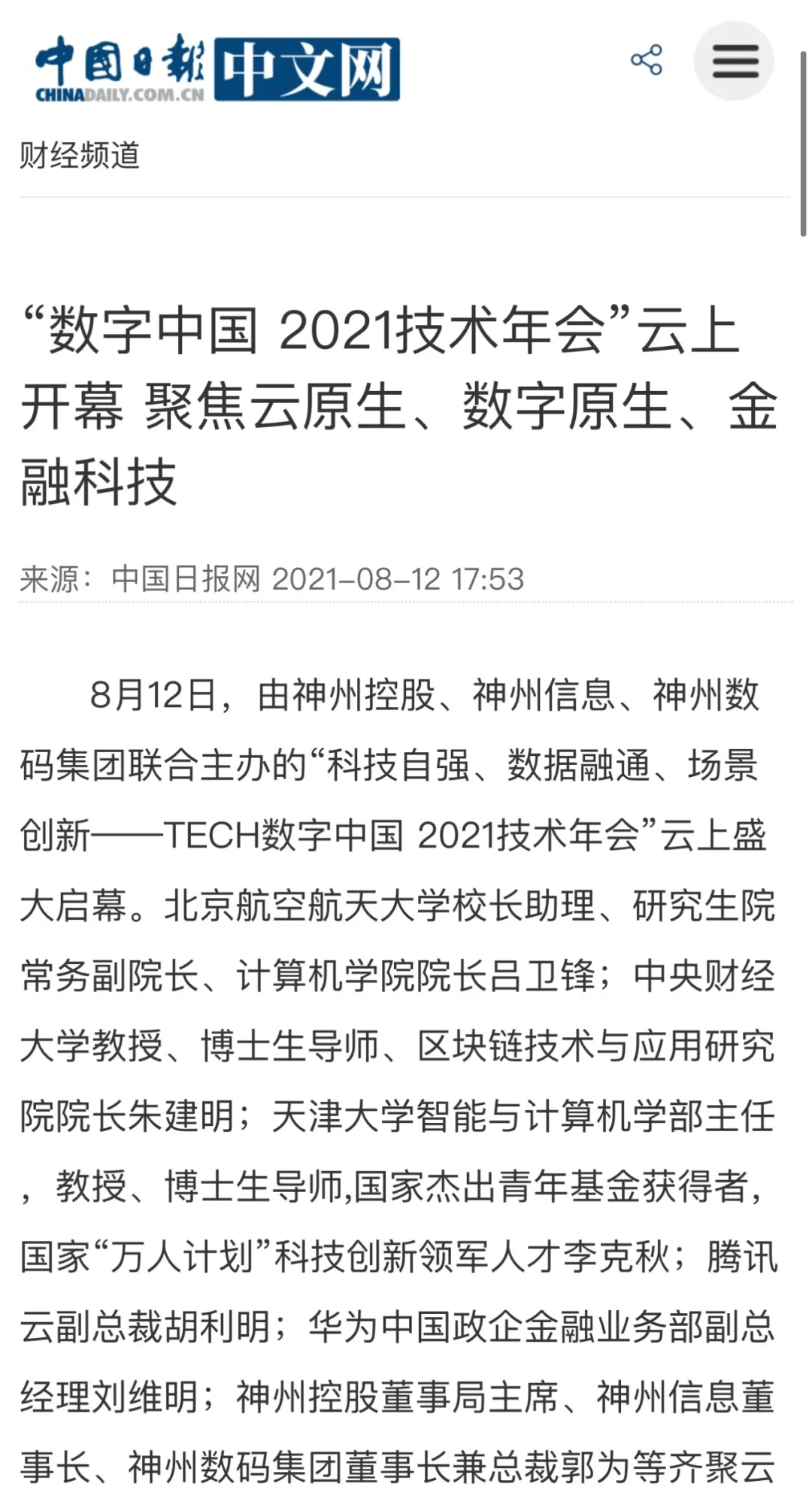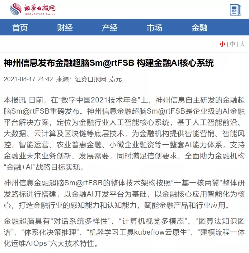 8月12日,由神州控股、BB贝博艾弗森官网、bb贝博艾弗森集团联合主办的“科技自强、数据融通、场景创新——TECH数字中国 2021技术年会”云上盛大启幕,发布神州信创云、ModelB@nk5.0、金融超脑Sm@rtFSB、云原生数字化安全底座、园区智能体等重磅产品,国内各大权威、影响力媒体多角度多频次对盛况进行报道!