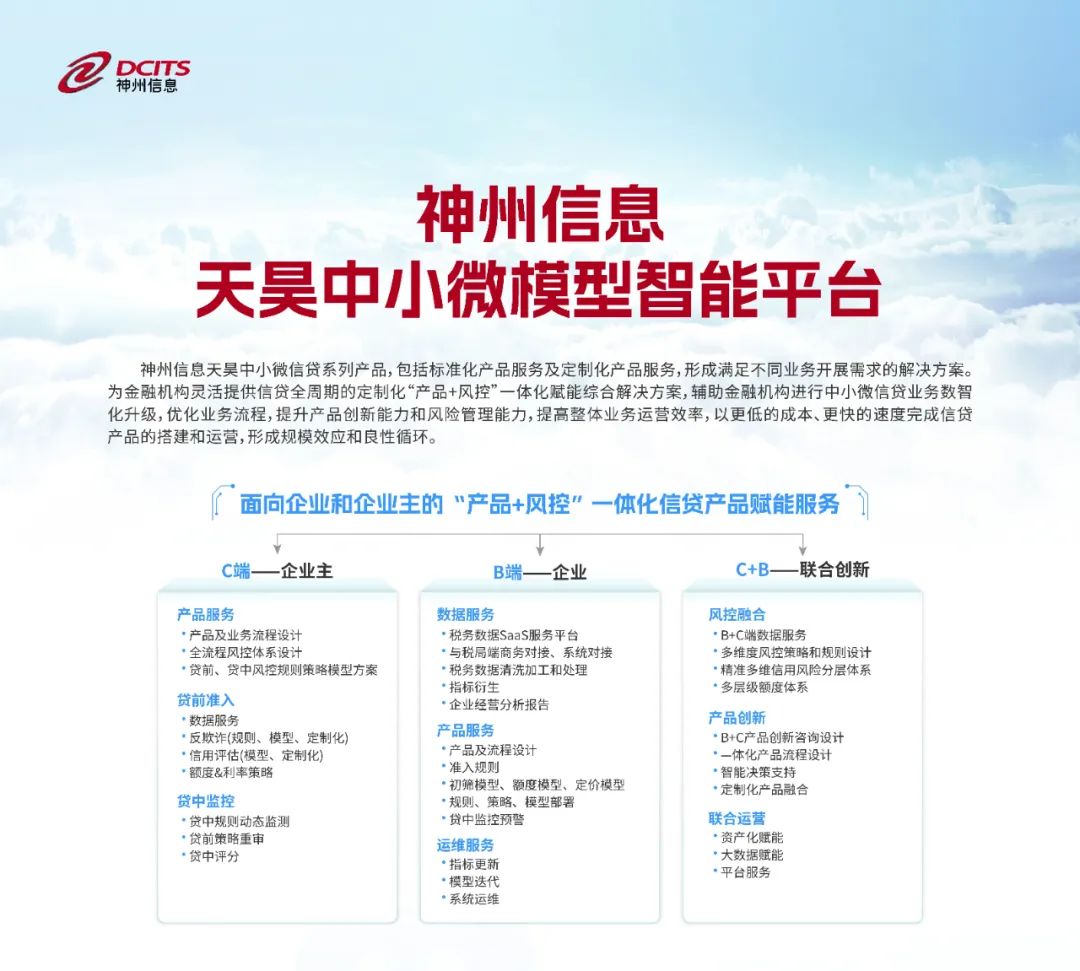 天昊中小微模型智能平台,以信用评估为基础结合数据建模技术,构建中小微信贷产品赋能体系,为金融机构灵活提供信贷全周期的定制化“产品+风控”一体化赋能综合解决方案,辅助金融机构进行中小微信贷业务数智化升级,以更低的成本、更快的速度完成信贷产品的搭建和运营,扩大产品目标客群,将更多中小微企业纳入服务范围,形成规模效应和良性循环。