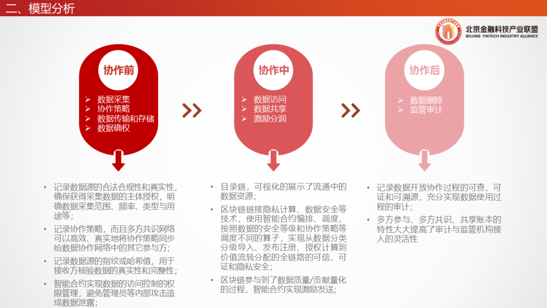本报告提出了基于数据全生命周期的协作模型,包括数据协作前制定开放策略达成协作共识、协作中开展数据流转计算以及协作后配合监管审计。进一步地提出了基于区块链技术的数据协作网络参考实现,明确了六类角色,引入了数据引擎、计算引擎、协作引擎以及相应的核心功能模块,提出权限管控、密码安全、数据安全等安全要求,最终通过数据协作形成立体的网络形态。BB贝博艾弗森官网子公司神州方圆产品中心副总经理杨文锋、神州方圆产品中心软件架构师姜涛参与编写,报告已于近日发布。