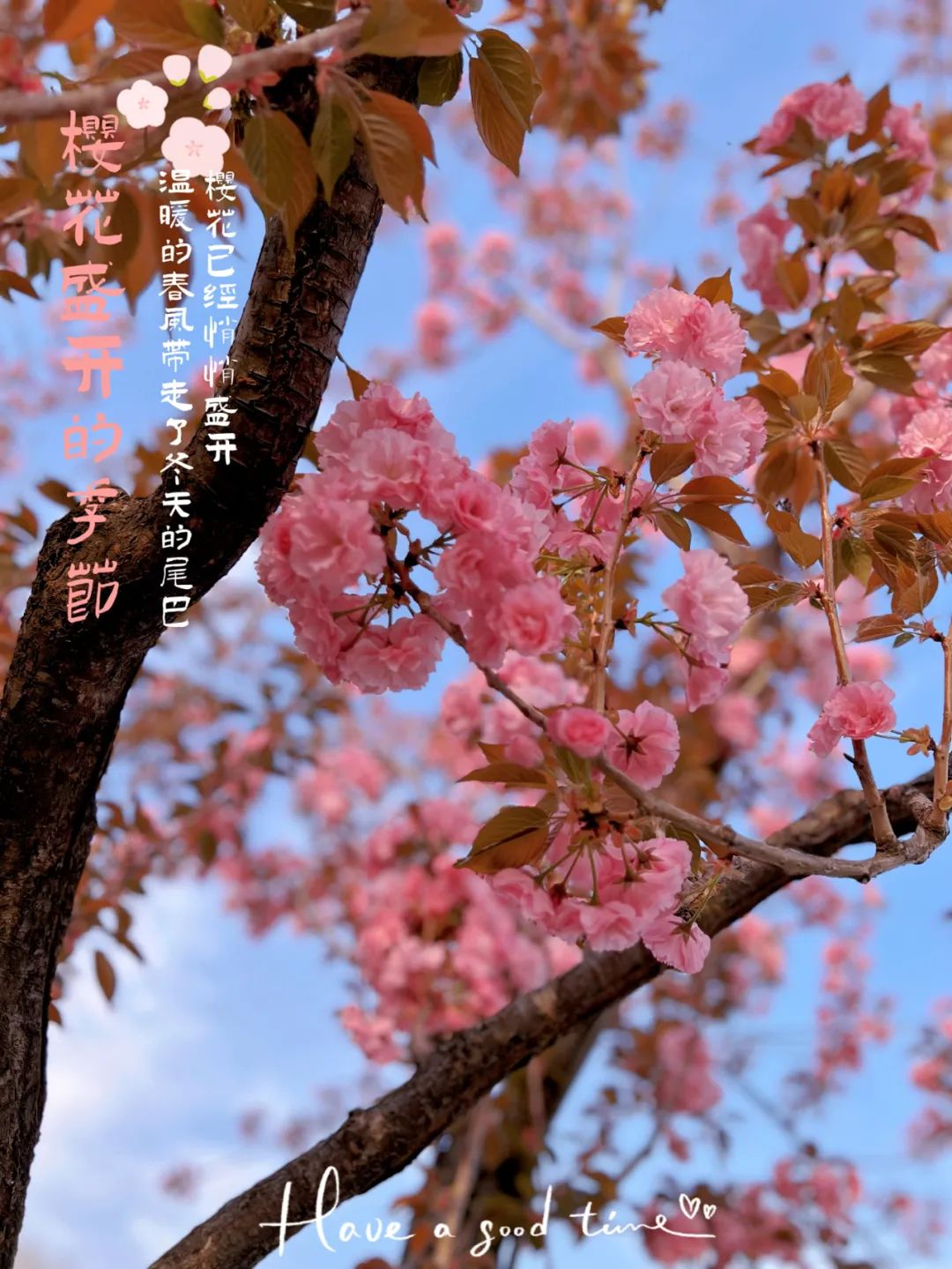 樱花盛开的季节,温暖的春风已带走冬天的尾巴。引用一首白居易先生的诗,“春风先发苑中梅,樱杏桃梨次第开;荠花榆荚深村里,亦道春风为我来。”