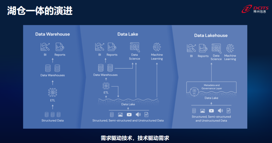 需要说明的是,这张图来自国外,图里没有出现数据仓库,这并不是说数据仓库消失了。当我们说数据仓库、数据湖的时候,其实有两种说法,一种说法是指硬件平台,一种说法是指数据的组织结构。这张图里说的是硬件平台,指的是用一个硬件平台来实现湖和仓的建设,也被认为是真正的湖仓一体。