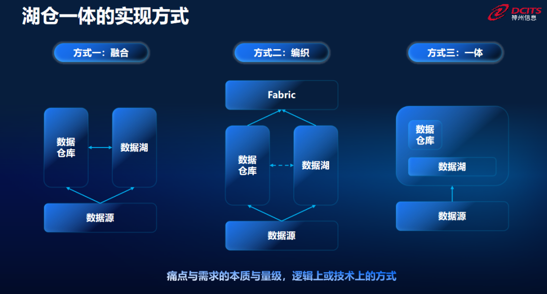 接下来,我们来看一下国内建设湖仓一体的几种方式。方式一和方式二我们可以认为是逻辑上的一体,方式三是平台级的一体。